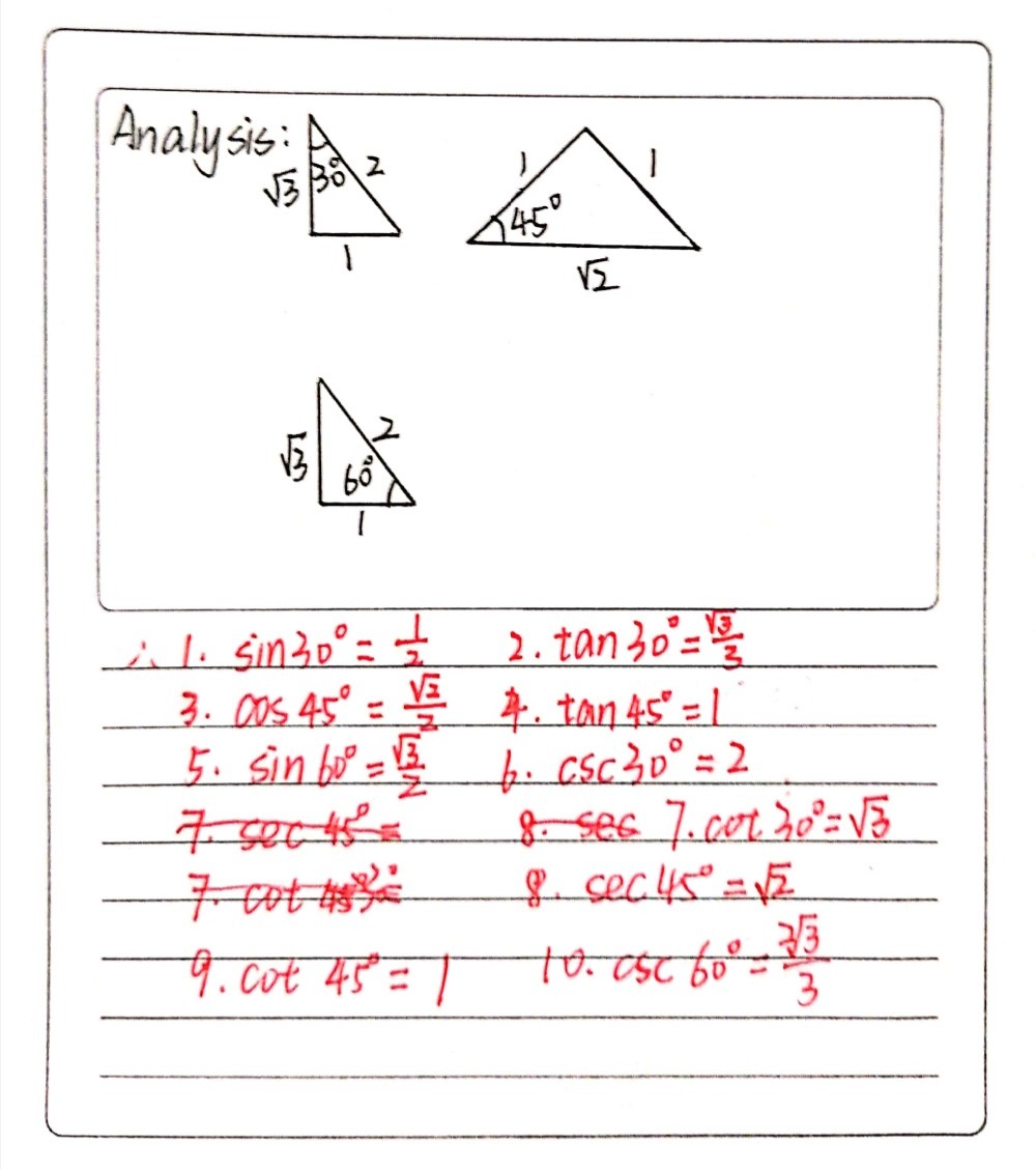 Trigonometric ratios of some special angles. Sine, cosine and tangent, shortened to sin, cos and tan. Trigonometric ratios are the ratios between edges of a right triangle. The relation between the sides and angles of a right triangle is the basis for trigonometry. It is a special triangle in which one angle is 90° and the other two are less than 90 question 4: